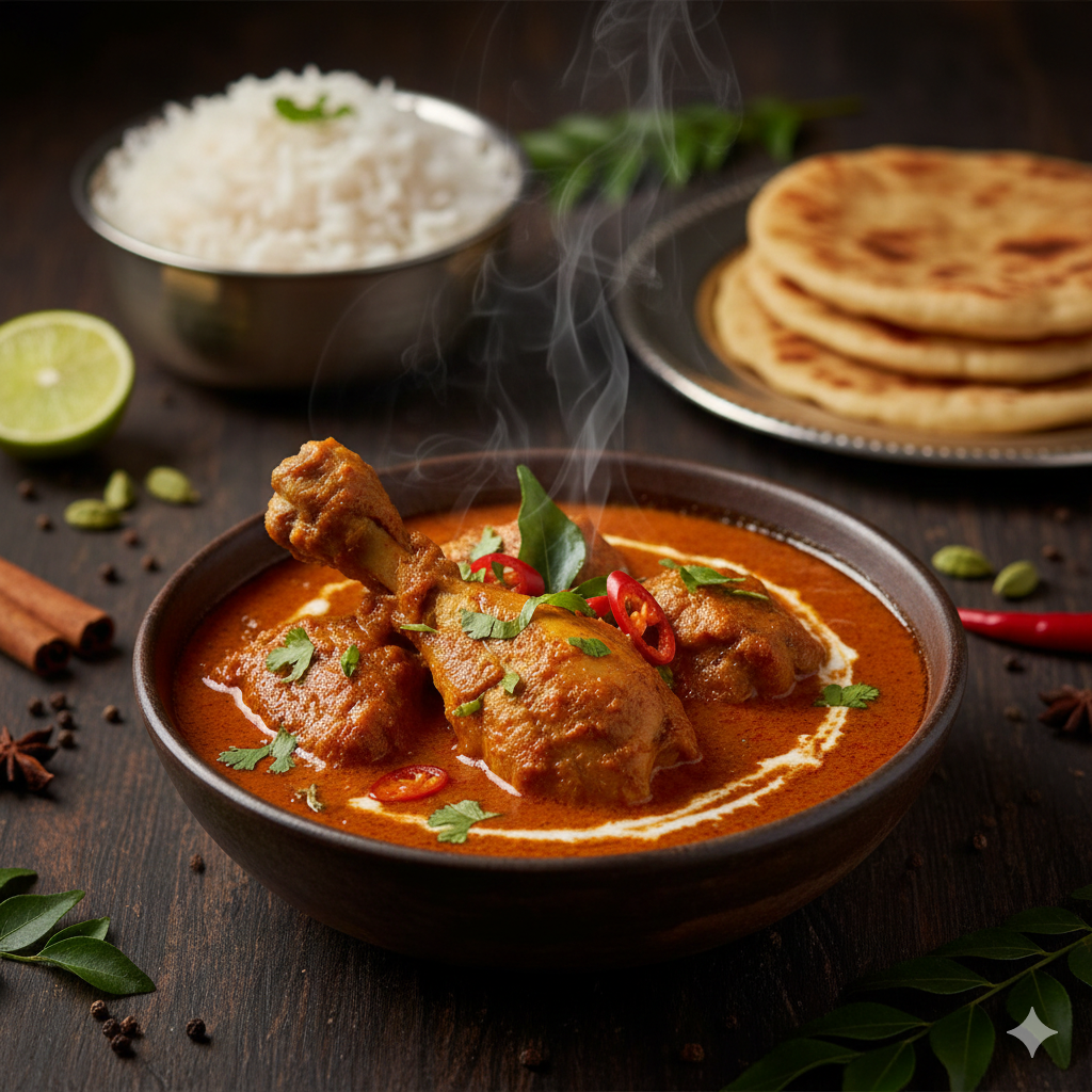 A traditional Sri Lankan-style chicken curry, cooked with aromatic spices, coconut milk, and local herbs, delivering a rich, flavorful, and mildly spiced dish